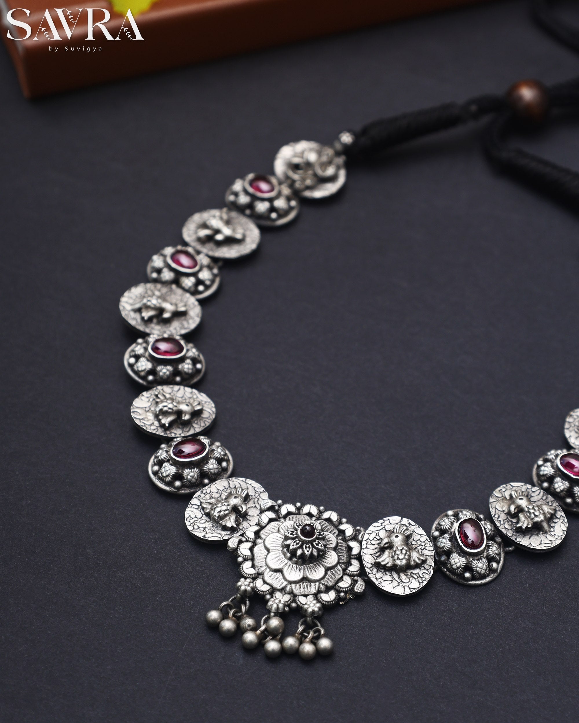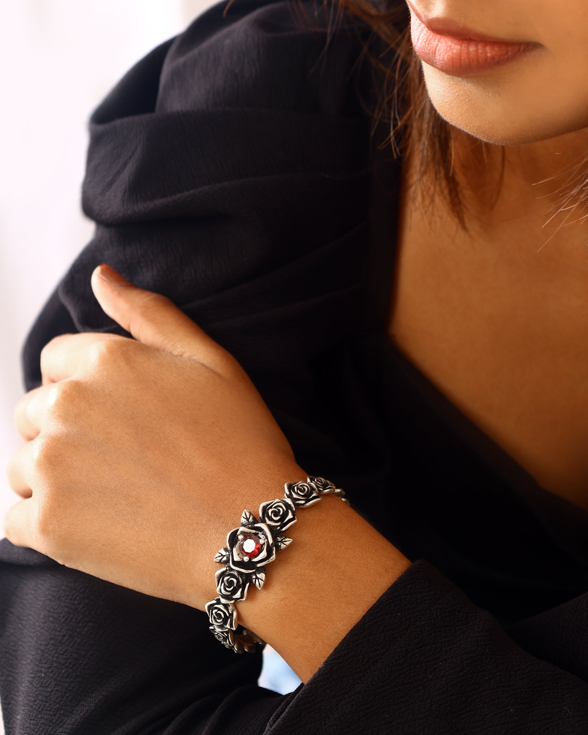 Regular price Rs. 19,000.00Sale price Rs. 19,000.00 Regular priceUnit price / perThis striking bracelet features a continuous chain of oxidized silver roses, centered by a single large red stone.