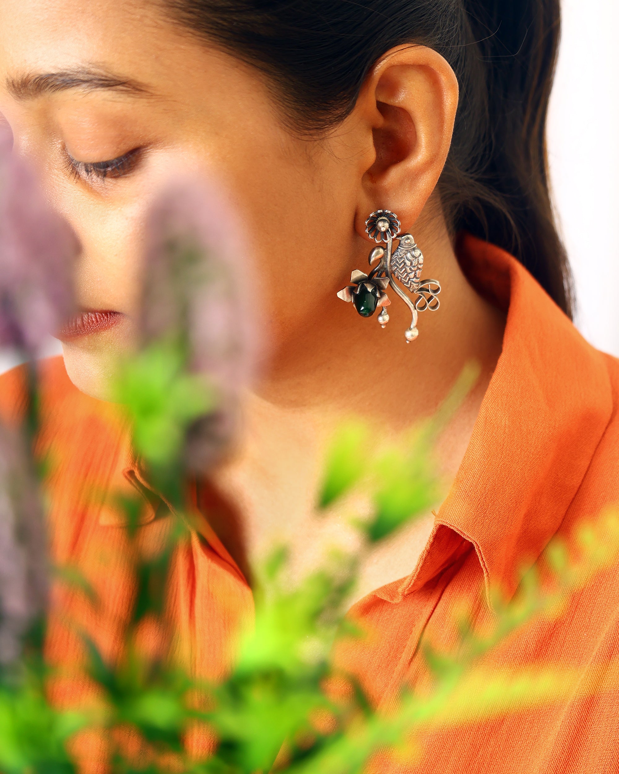 Regular price Rs. 11,600.00Sale price Rs. 11,600.00 Regular priceUnit price / perDimension: 2 inches x 1 inches Whimsical oxidized earrings featuring a small detailed bird perched beside a blooming flower with a central dark green stone.
