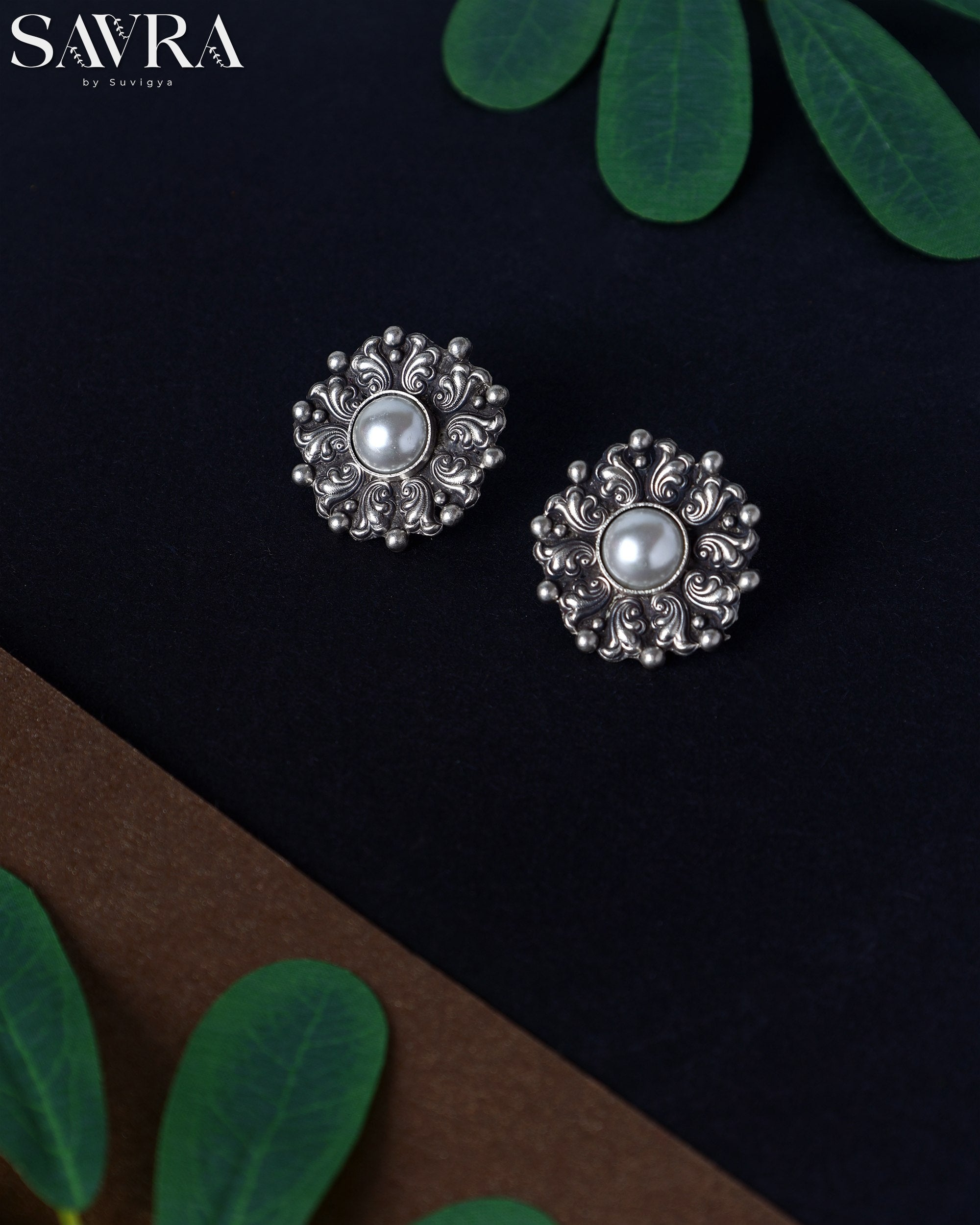 Regular price Rs. 6,800.00Sale price Rs. 6,800.00 Regular priceUnit price / perDimension: 1 inches Traditional oxidized silver stud earrings with a detailed swirling floral border around a central, prominent white freshwater pearl.
