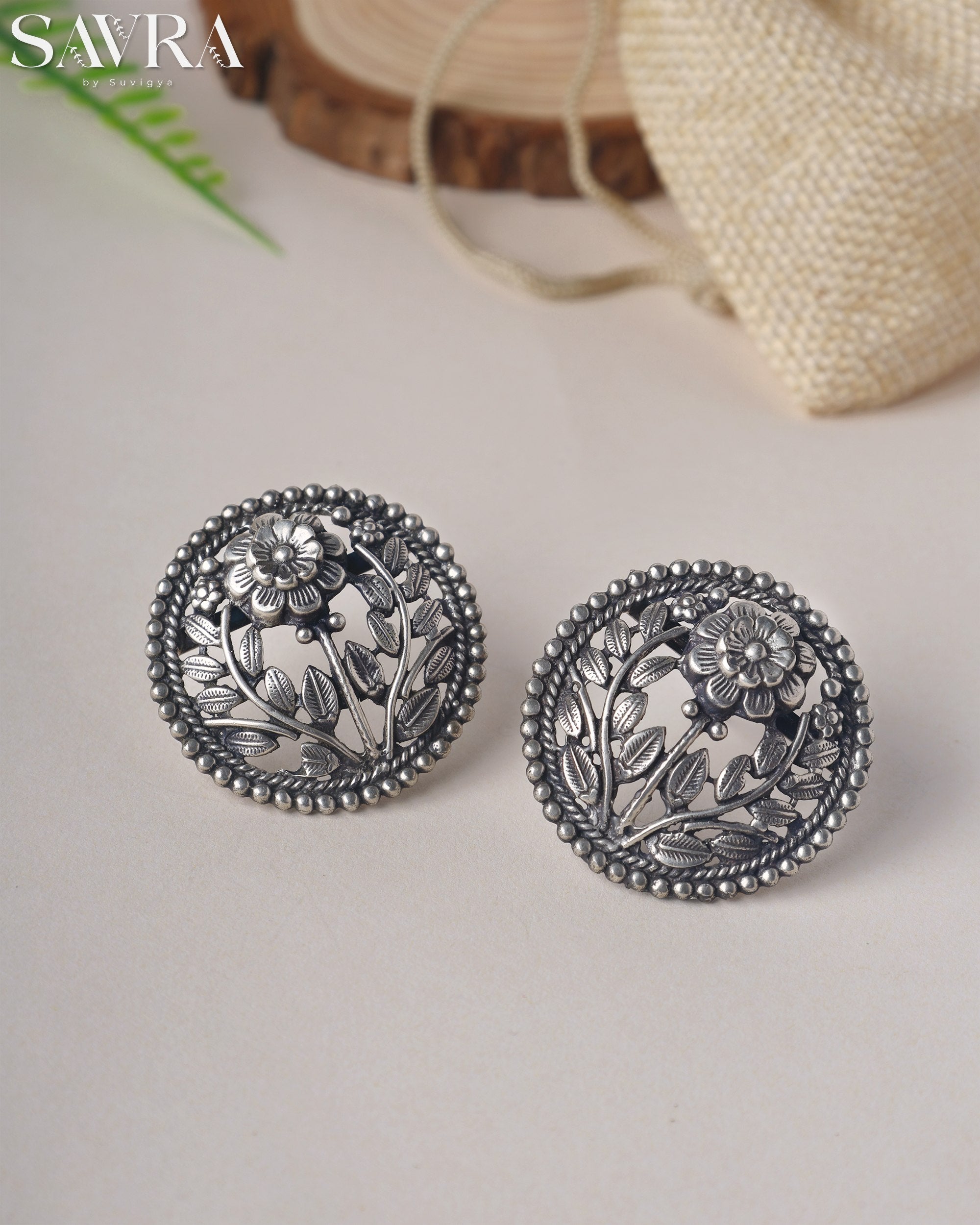Regular price Rs. 11,000.00Sale price Rs. 11,000.00 Regular priceUnit price / perDimension: 1.1 inches Large, oxidized silver studs featuring a deeply detailed floral and vine wreath motif encircled by silver beading.