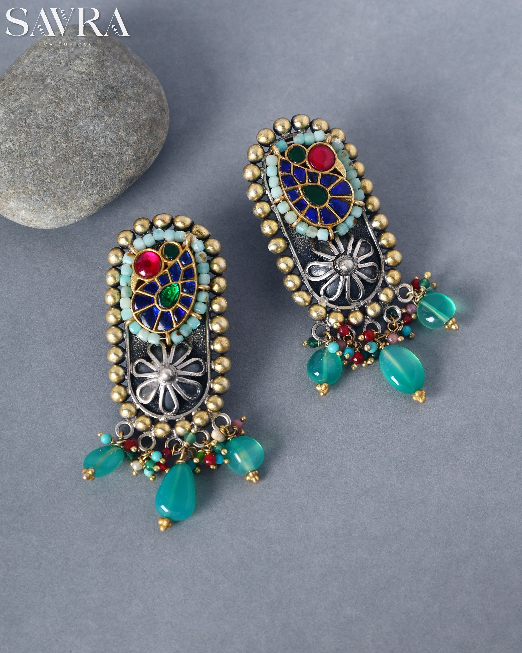 Regular price Rs. 12,000.00Sale price Rs. 12,000.00 Regular priceUnit price / perDimension: 2.4 inches x 1 inches Oxidized drops featuring vibrant Meenakari enamel work in primary colors, finished with dangling turquoise agate stones.