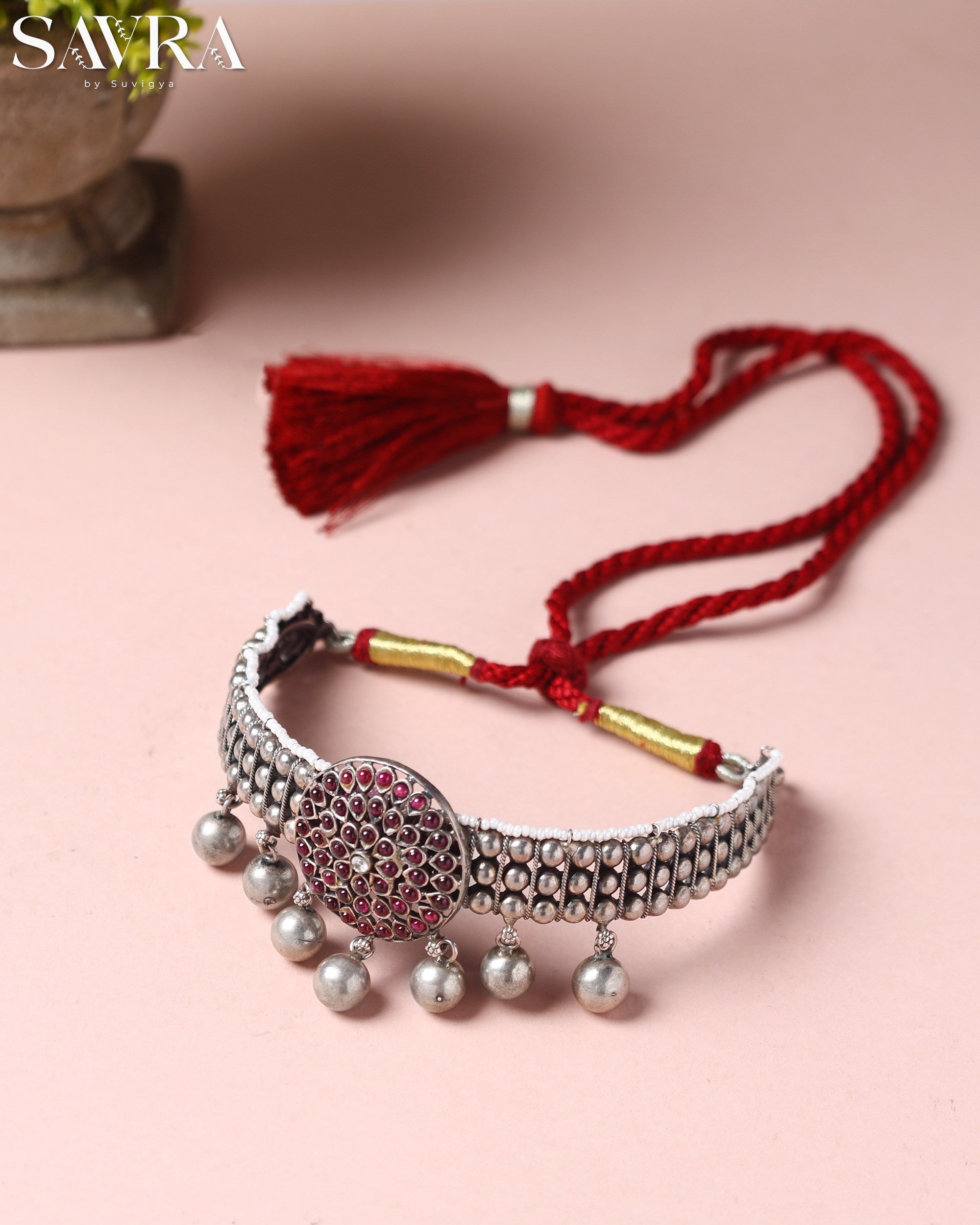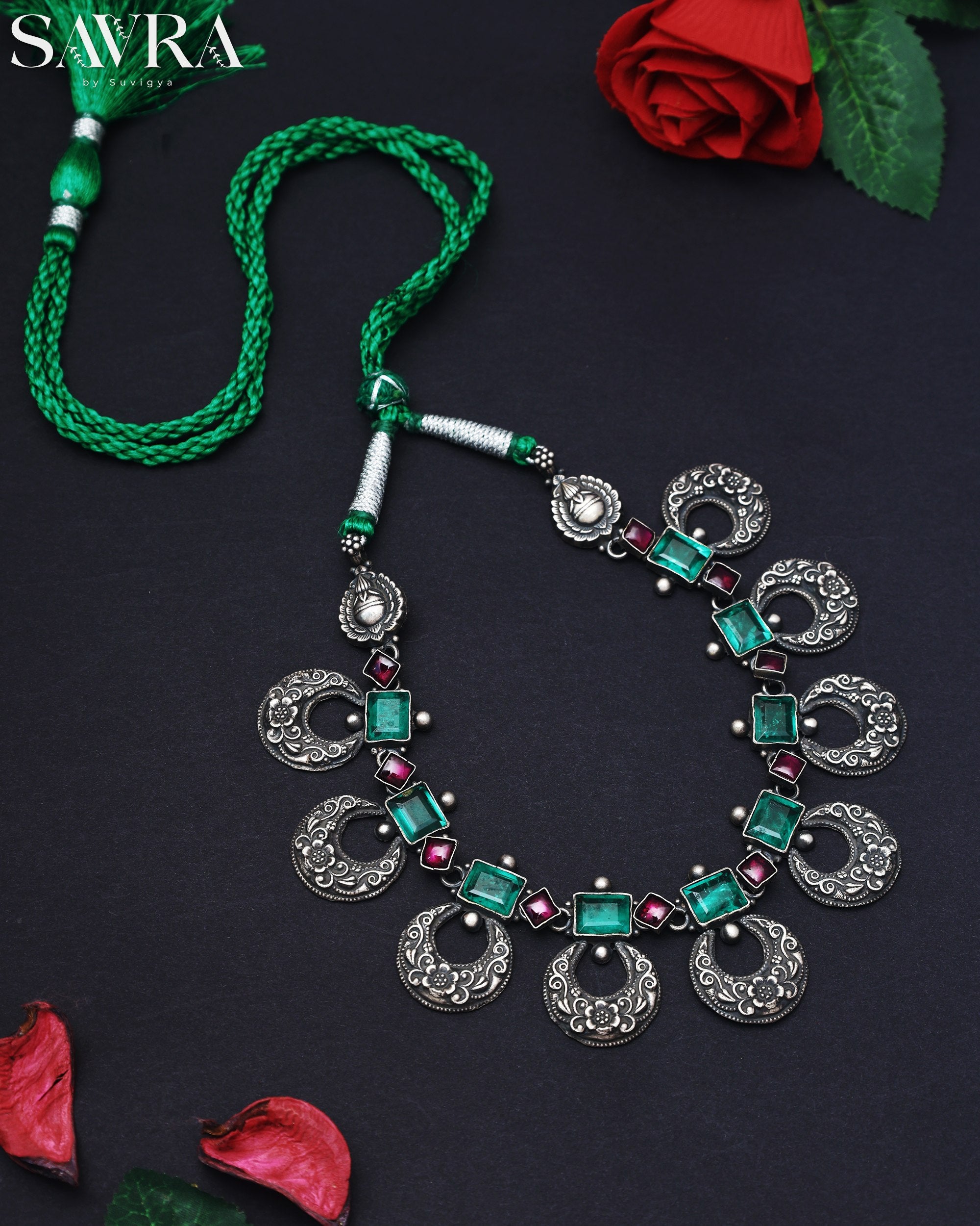 Regular price Rs. 34,000.00Sale price Rs. 34,000.00 Regular priceUnit price / perNecklace Dimension: 12 inches x 1 inchesEarrings Dimension: 1.5 inches A striking oxidized silver choker set with repeating square emerald-green and ruby-red stones alternating with detailed...