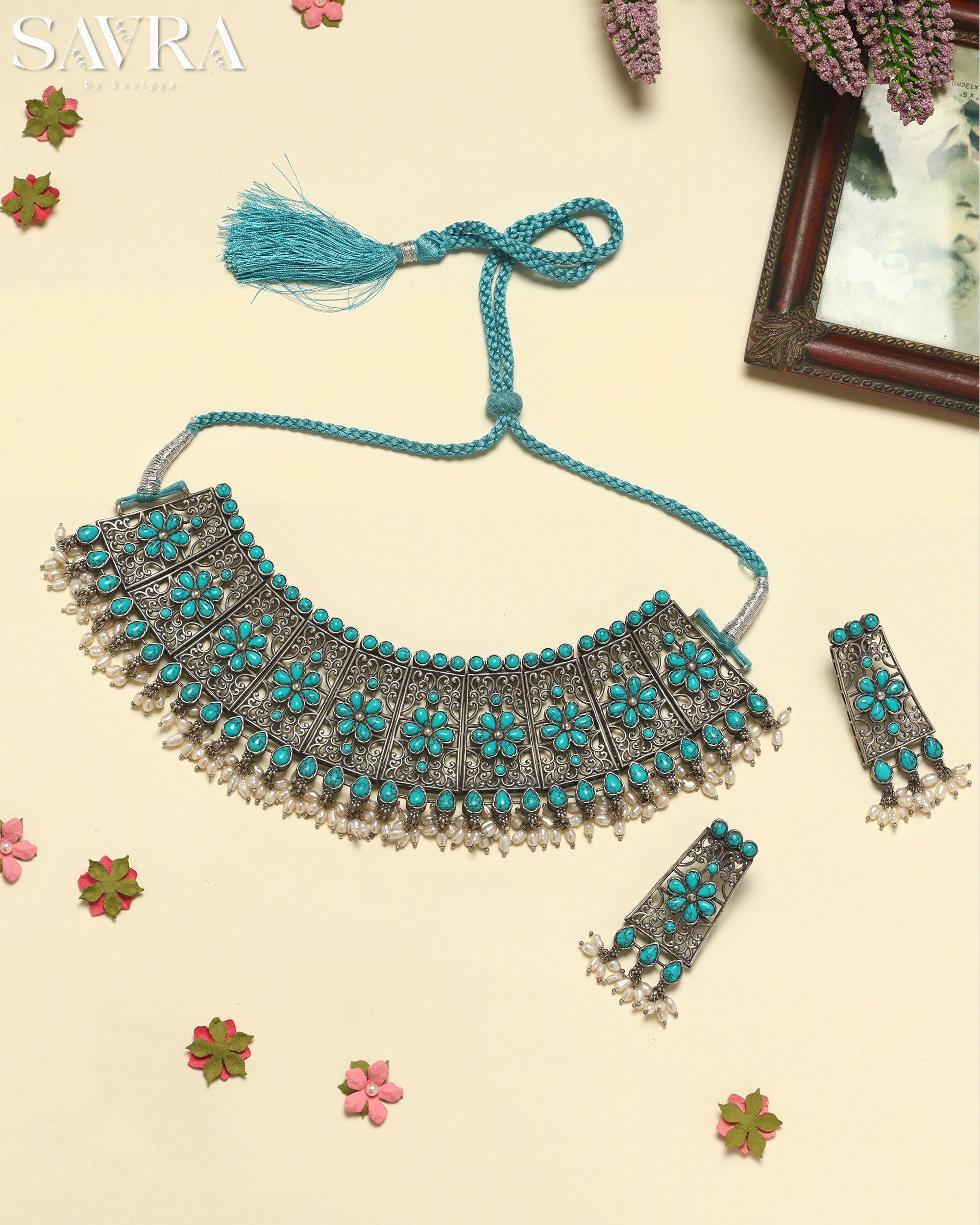 Regular price Rs. 75,000.00Sale price Rs. 75,000.00 Regular priceUnit price / perLength: 22cm Width: 7cm Earring length: 6cm Width: 2.5cm Material: Silver Colour: Silver & Turquoise