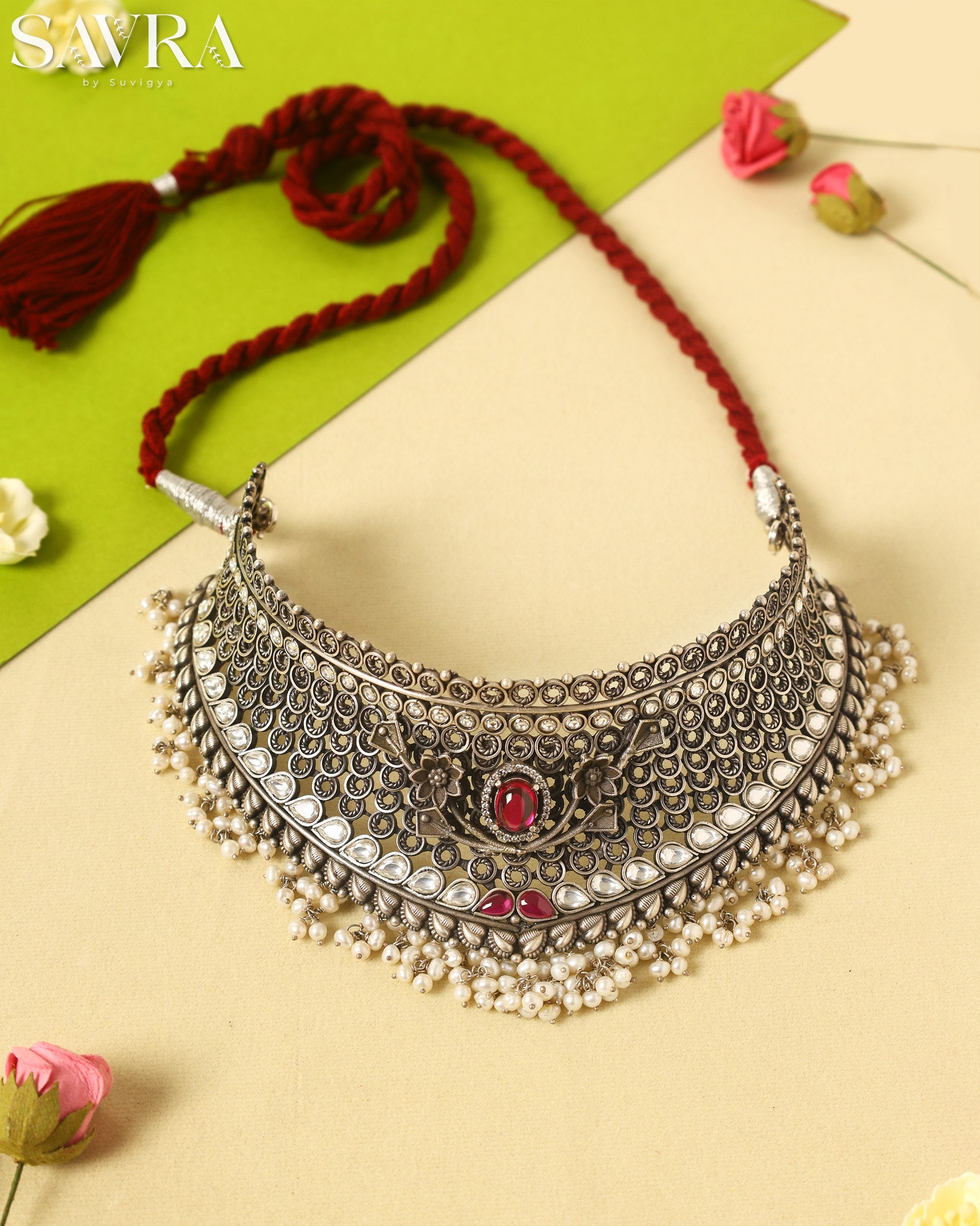 Regular price Rs. 23,000.00Sale price Rs. 23,000.00 Regular priceUnit price / perNecklace Dimension: 9.5 inches x 1.7 inches A bold, antique choker set featuring layered oxidized silver panels, intricate beading, and a dense pearl drop fringe.