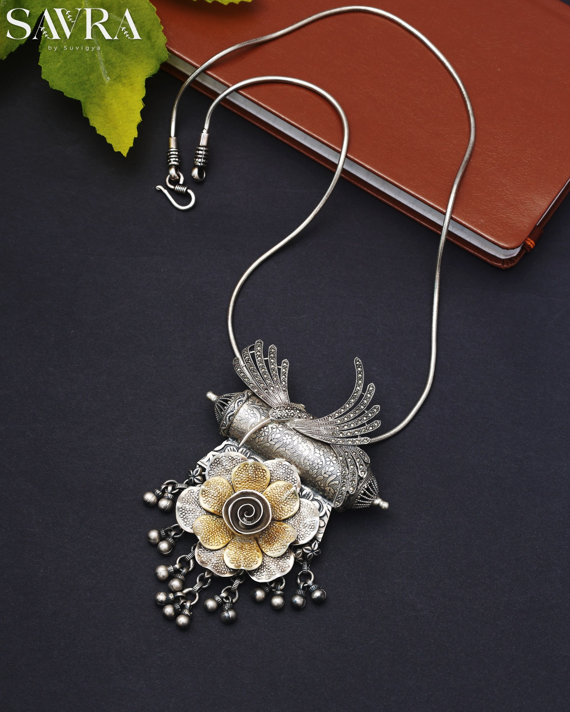 Regular price Rs. 42,000.00Sale price Rs. 42,000.00 Regular priceUnit price / perNecklace Dimension: 24 inchesPendant Dimension: 4 inches x 2.2 inches A complex statement pendant featuring an oxidized silver bird body paired with a large gold-toned flower...