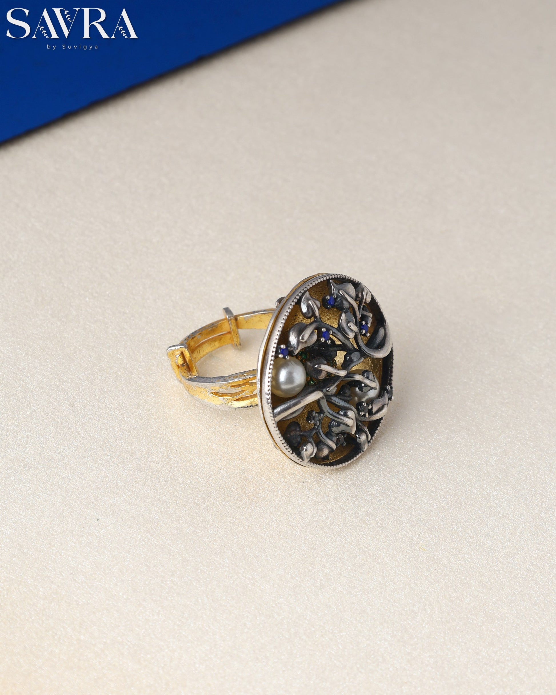 A spectacular ring featuring a large circular top with a detailed floral silver overlay on a textured brass-toned background, accented with pearls and blue stones.