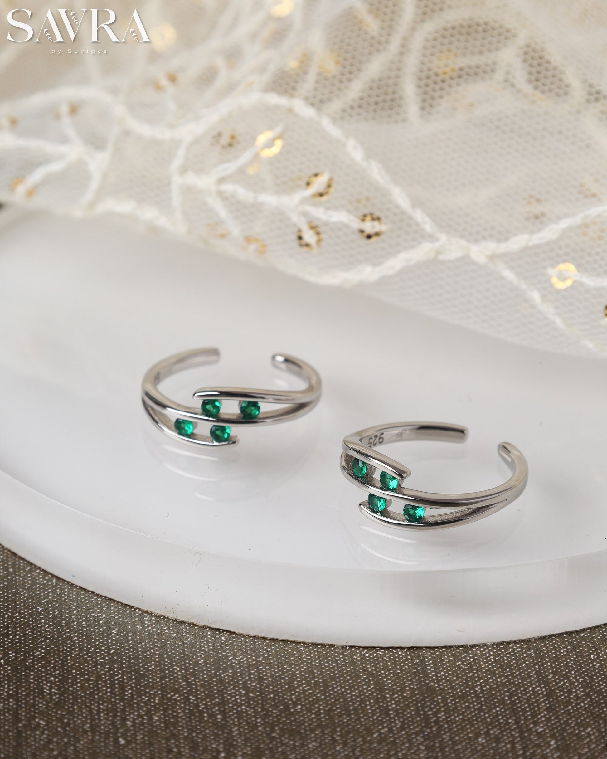 A pair of adjustable silver toe rings featuring parallel bands that wrap to hold three small, sparkling emerald-green stones.