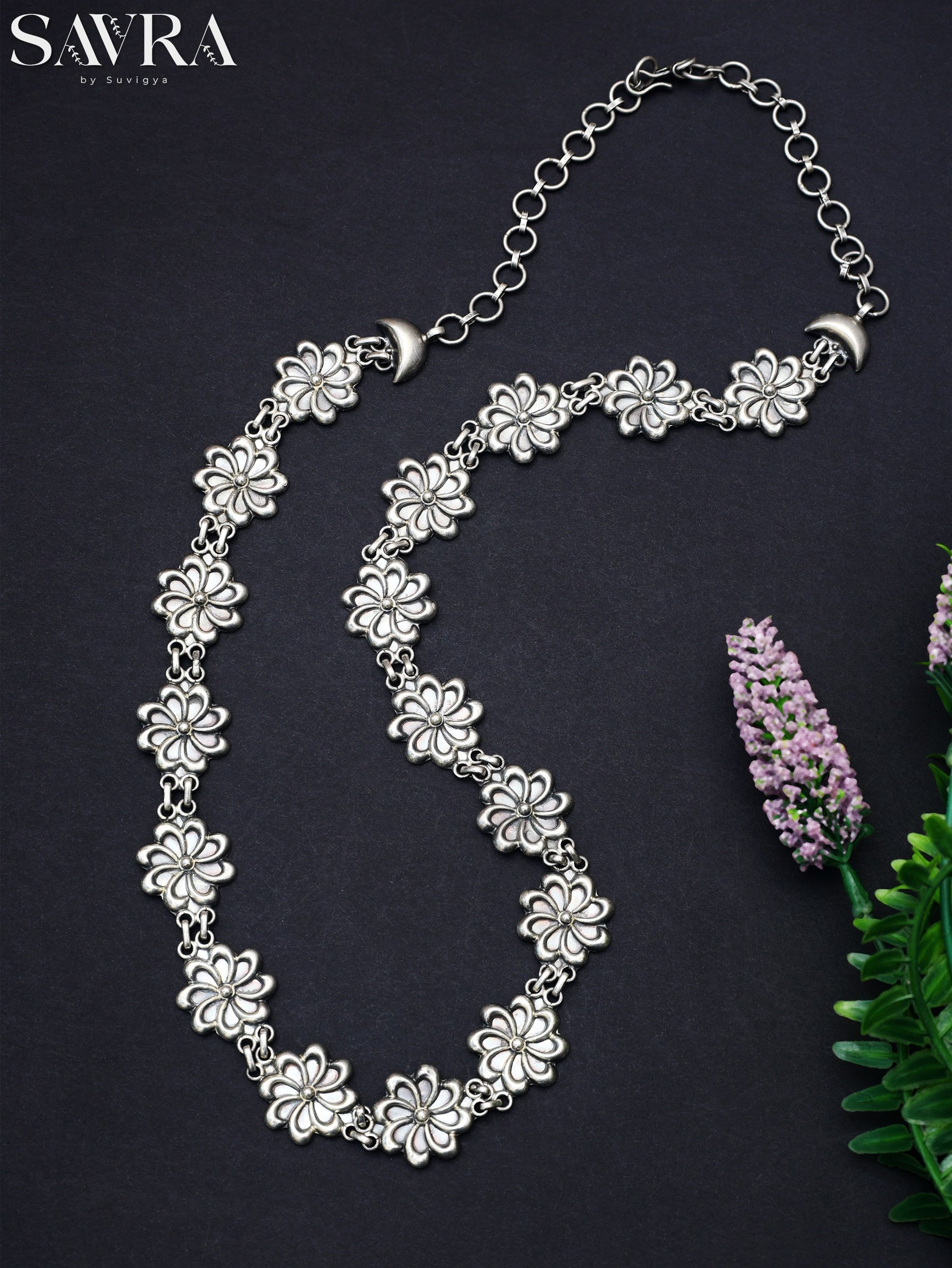 A long, light-weight necklace composed of interconnected oxidized five-petal floral links and an adjustable chain.