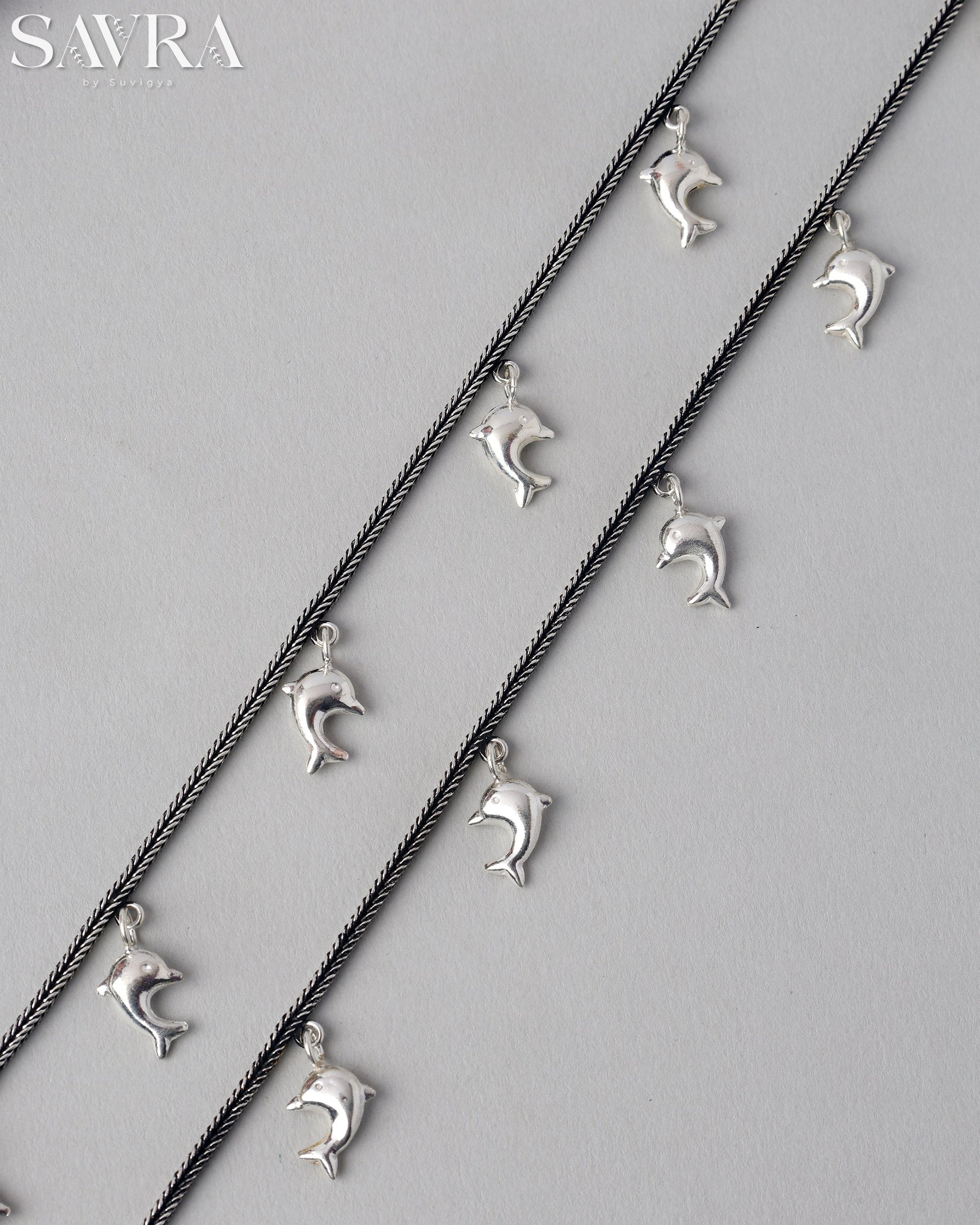 Cute dolphin charms dangle from an oxidized snake chain, giving a fun, aquatic theme to this anklet pair.