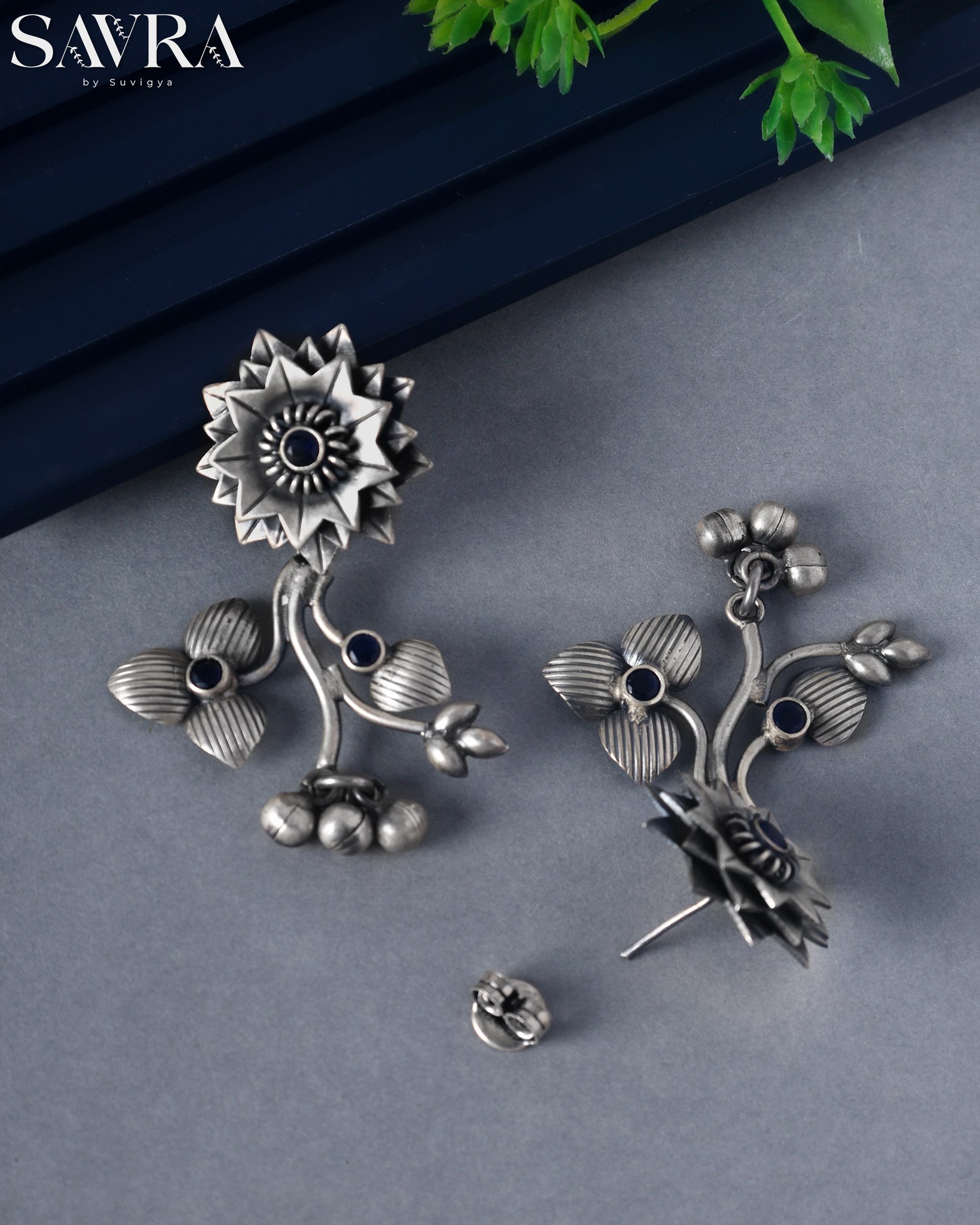 Oxidized silver drops featuring a large star-like flower stud and a trailing vine motif with dark blue stone accents.