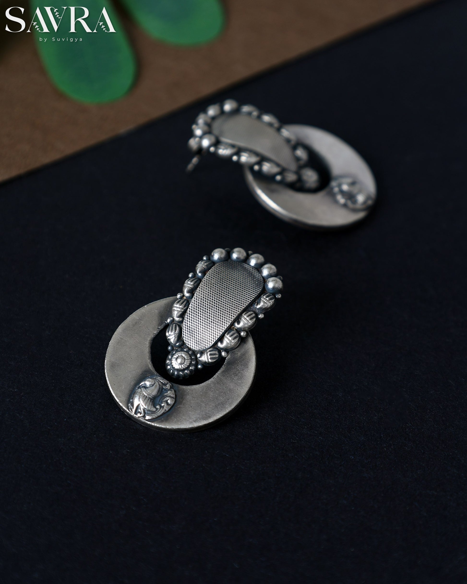 Contemporary oxidized silver drops featuring a textured studded link connected to a smooth circular disc with a small embossed motif.