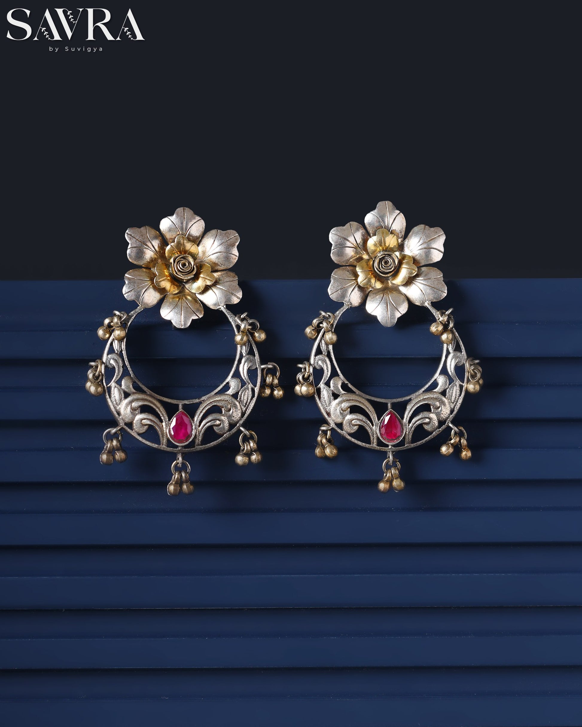 Bold oxidized hoops topped with a lifelike brushed gold-toned floral stud and accented with a central ruby-red stone.
